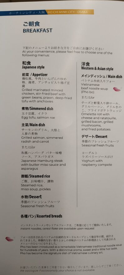 ウェルカムドリンクはシャンパンをチョイス🍾。深夜便なので朝食メニューが配られました。