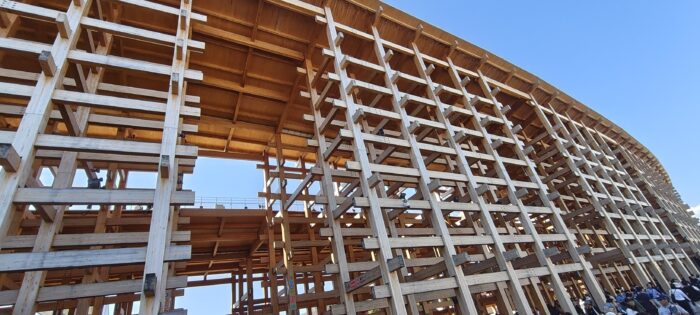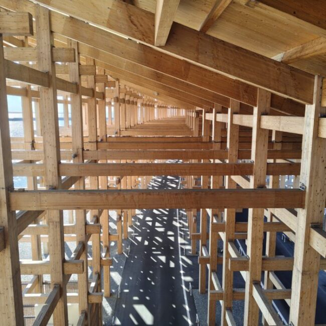 パビリオン巡りをという気持ちはありませんが、大屋根リングは是非一周しておきたいと思っていました。全周で約2kmとされてきた大屋根リング。約30m幅ありますが通路の中心部に当たる15m地点の長さが2025mであることが判明し、奇しくも開催年の2025年と同じ、2025になったとのこと。偶然を装ってるけれど設計してる人はわかってたんじゃなかろうか?エスカレーターで登ってみました。