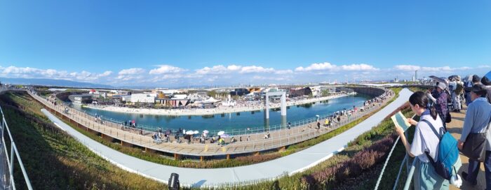 2㎞だったら30分もあれば1周できますが、法面っぽい場所でおにぎりを頬張ったりしたり、色々なパビリオンを眺めたり