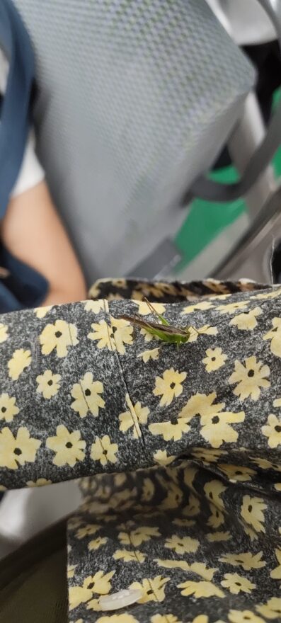 帰り道、えらく遠回りして到着した地下鉄の駅から思いのほかスムーズに乗車できた地下鉄車内で、袖口に何か動くものを発見したのですが、なんとバッタでした!
