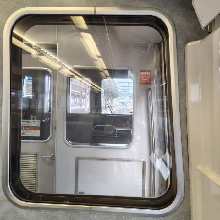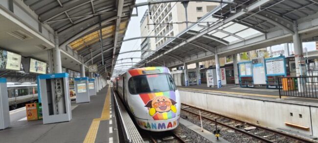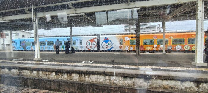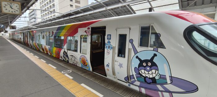 なんと、アンパンマンのラッピングがされた車両でした!この少し前に作者を題材にした朝ドラが放送されていてまだその余韻が冷めやらぬタイミングだったので、テンションが上がりました。さほど混雑しないだろうと自由席で切符を購入していたのですが、さほどというか全然混雑せず・・・景色のいい先頭車両の一番前に陣取ることにしました!