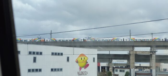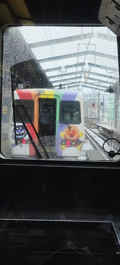 ほぼほぼ貸切のような状況で高松駅を出発しました。カーブの多い路線をこのかわいい雰囲気の特急列車はガンガン走っていきます。カーブに差し掛かると車両を傾けて走る、いわゆる振り子電車なのでカーブもスピードを落とさずに疾走しており、そのスピード感に魅了されました。宇多津駅で岡山方面からやってくる特急と併合するようで、岡山からの車両を先に活かせるために信号待ちの停車をしていたら、岡山からの特急がやってきましたが、こちらもアンパンマン車両!